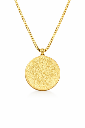 سلسلة أنيقة بتصميم دائري مميز محفور عليها آية الكرسي بخط عربي دقيق يمنحها طابعًا روحانيًا وفخمًا في نفس الوقت. التصميم الذهبي اللامع مع التفاصيل المحفورة بعناية يجعلها قطعة مميزة تناسب الإطلالات اليومية والمناسبات الخاصة.