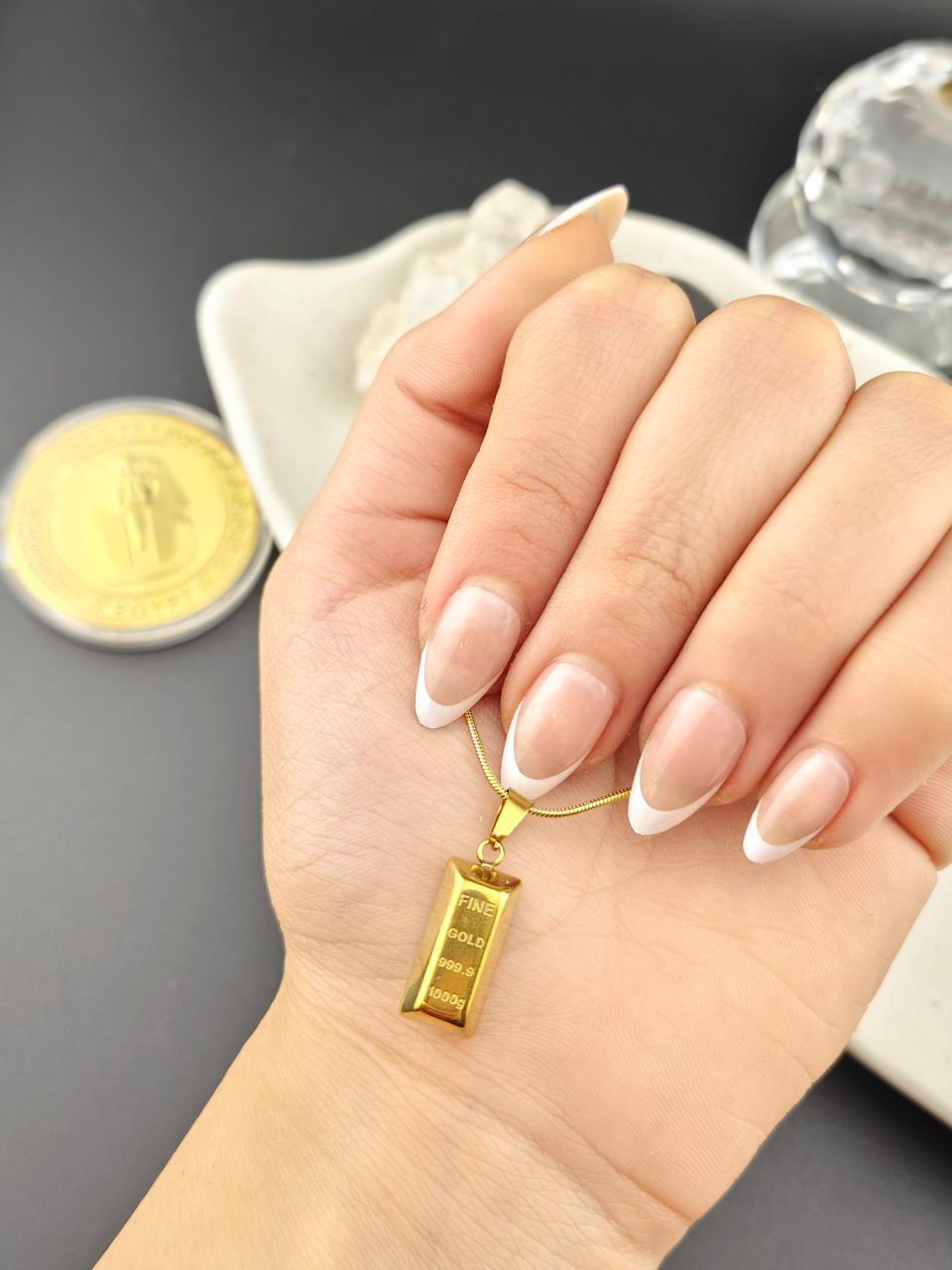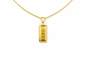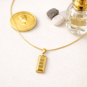A sleek gold bar pendant inspired by classic bullion design, crafted from stainless steel with a luxurious gold plating and suspended on a delicate chain. Minimal, modern, and designed to keep its shine for everyday elegance.