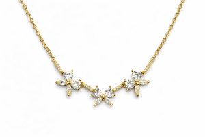 An elegant gold necklace featuring three delicate floral motifs, each adorned with sparkling stones that reflect light beautifully. Its refined design adds a touch of femininity and timeless charm, making it perfect for both everyday elegance and special occasions.